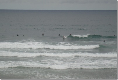 We drove around until we finally found a street that went down to the water. We parked in a parking lot next to one of the many colleges here and went to see what everyone was looking out. This time it was human seal or rather surfers. There were probably a hundred or so in the water and on the beach.